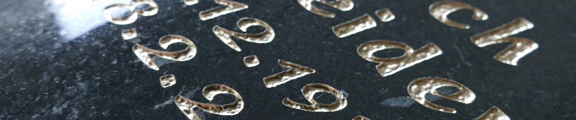 Eine Wiesengrabstein-Beschriftung wird entweder in den Stein graviert (hochwertige Sandstrahlgravur), geschlagen oder als Metallschriftzug aufgesetzt. Bei der ersten Variante erstellt der Steinmetz eine Sandstrahlgravur Ihrer Inschrift, die 2-3 mm tief in den Stein eingearbeitet und anschließend mit Ihrer Wunschfarbe ausgelegt wird.